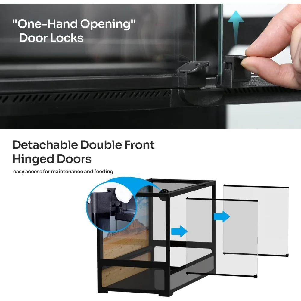 - 【One-hand Opening Door & Unique Blacked-out Back】: Detachable double front hinge doors with “one-hand opening” door locks allow easy access for maintenance and feeding,Give you plenty of decoration space for your terrarium;Unique blacked-out PVC back to reduce stress for the animals, it looks good even without any decoration.